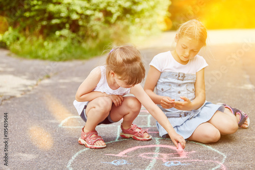 Mädchen malen Hüpfspiel mit Kreide auf Boden