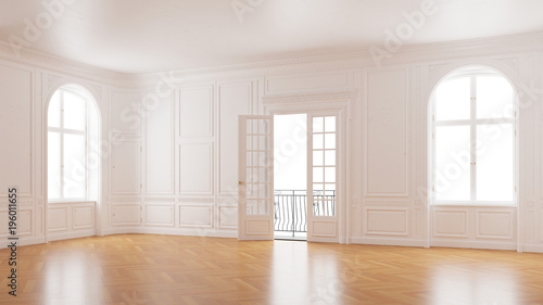 Leeres Altbau Zimmer mit Parkett, Stuck und Balkon