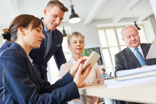 Silhouetten von Geschäftsleuten vor Collage aus vielen Mitarbeiter Portraits