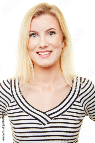 Junge blonde Frau frontal mit Händen vor der Hüfte