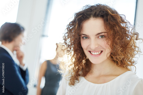 Confident businesswoman with curly hair engaging in a friendly conversation