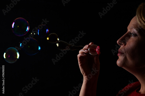 Colorful soap bubbles floating in a bright blue sky with fluffy clouds