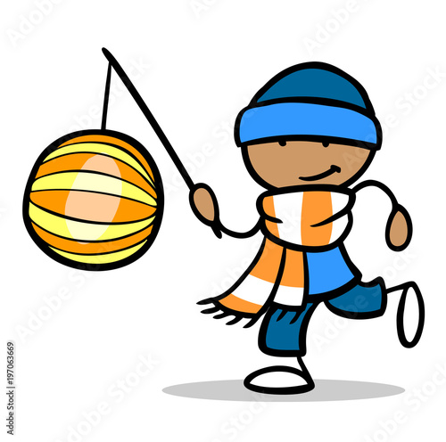 Junge in Winterkleidung mit gebastelter Laterne im Herbst