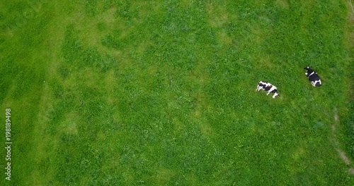 Summer Aerial View of Happy Cows Grazing by a Mountain Stream in the Austrian Alps.