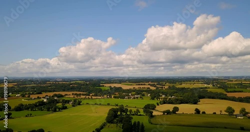 Idyllic rural landscape with rolling hills, vibrant green fields, and farmhouses