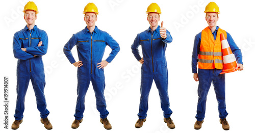 Bauarbeiter im Overall in verschiedenen Posen