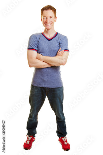 Smiling lumberjack in plaid shirt and jeans with hands in pockets. Full body shot isolated on white