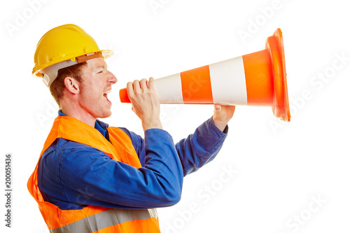 Blonde Frau im Blaumann mit Helm trägt einen Verkehrsleitkegel
