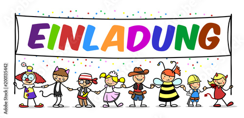 Gruppe Kinder mit Einladung Banner zu Karneval