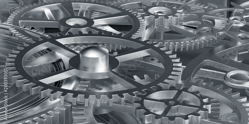 Panorama von Feinmechanik Uhrwerk Zahnrädern