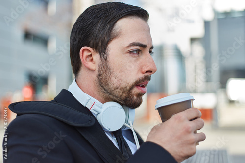 Nachdenklicher Geschäftsmann trinkt Kaffee