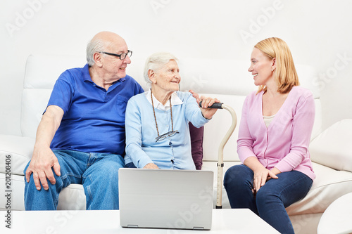Sozialarbeiter zeigt Senioren Laptop Computer