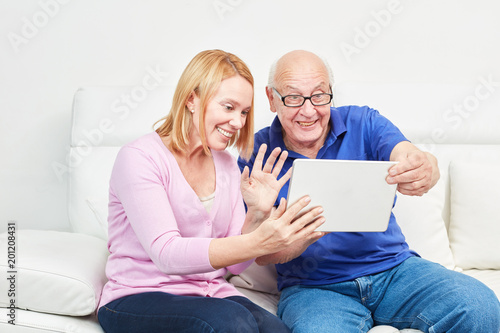 Frau und Senior mit Laptop bei einem Video Chat