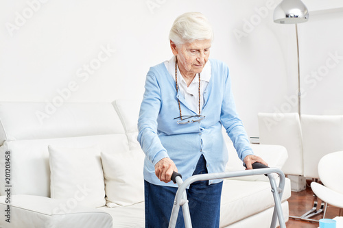 Lächelnde alte Seniorin sitzt im Rollstuhl