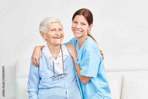 Lächelnde Pflegedienst Frau mit glücklicher Seniorin