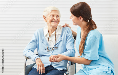 Krankenschwester mit einer alten Frau im Rollstuhl