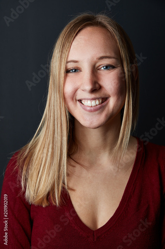 Zufriedene Studentin steht vor Tafel mit Muskel Armen als Konzept