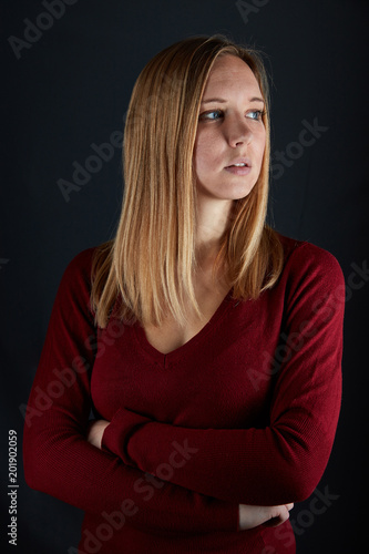 Nachdenkliche junge blonde Frau schaut zur Seite