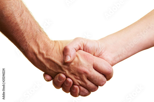 Handschlag vor vielen bunten Portraits einer Gesellschaft als Konzept für Miteinander