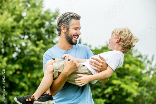 Vater trägt seinen Sohn in den Armen