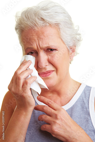 Seniorin schnaubt sich die Nase