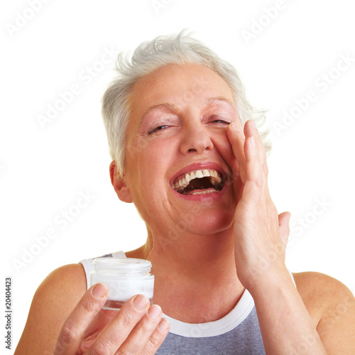 Lachende Seniorin zeigt Tabletten