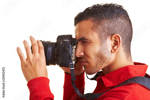 Mann schaut durch eine digitale Spiegelreflexkamera