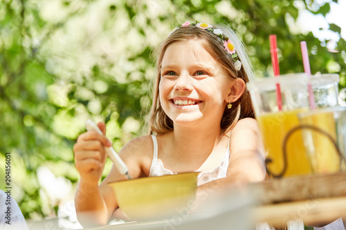 Smiling girl is eating healthy cereal