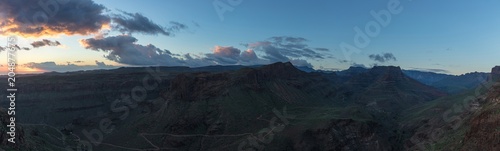 Scenic panorama of a dramatic landscape at sunset overlooking rugged mountains