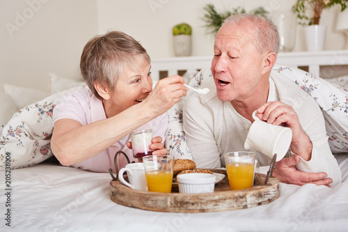 Senioren Paar betrachtet Fotos im Fotoalbum