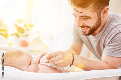 Vater wäscht sein Baby mit dem Waschlappen