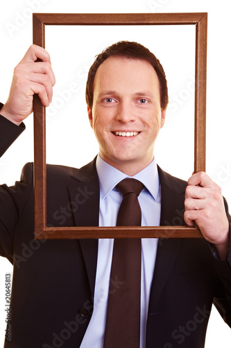 Hand mit Lupe sucht in Portraits als Umfrage und Marktforschung Konzept