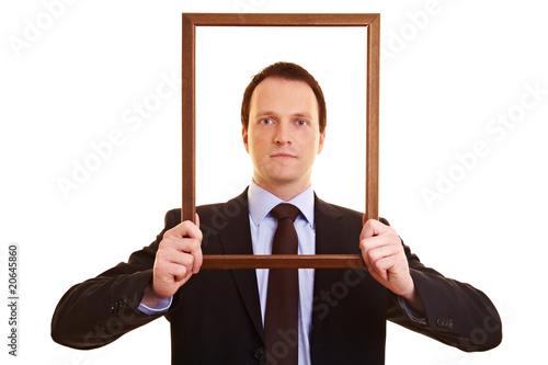 Hand mit Lupe sucht in Portraits als Umfrage und Marktforschung Konzept