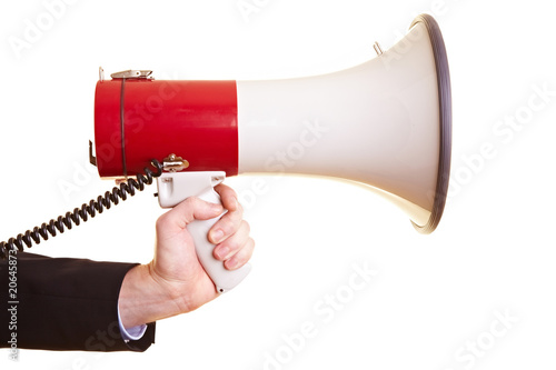 Hand with megaphone and red background