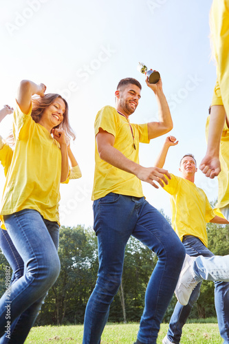 Sieger Mannschaft mit Pokal jubelt bei Teambuilding Event
