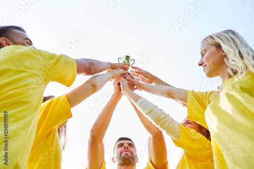 Sieger Mannschaft mit Pokal jubelt bei Teambuilding Event