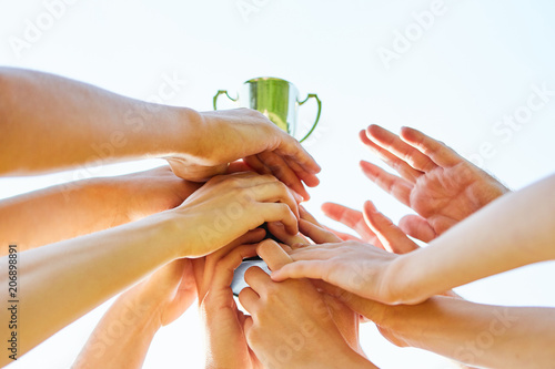 Sieger Mannschaft mit Pokal jubelt bei Teambuilding Event