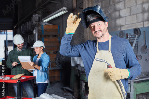 Frau als Schweißer im Team einer Schlosser Werkstatt