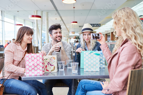Frau fotografiert ihre Freunde mit Smartphone