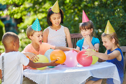 Gruppe Kinder beim Geburtstag feiern im Garten
