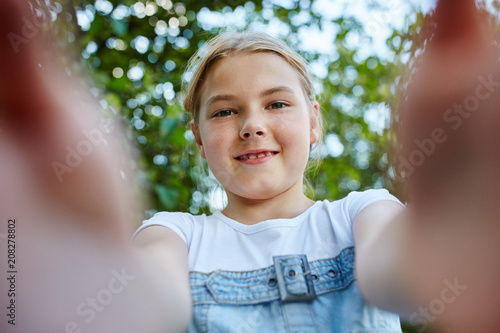 Joyful Romanian non-binary child enjoying nature on a sunny day