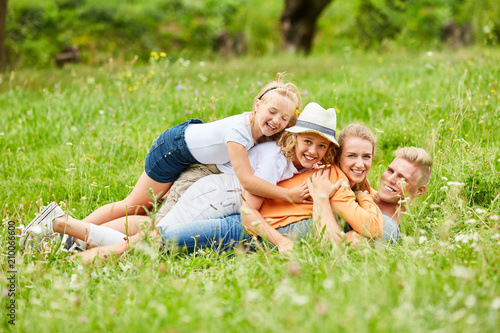 Familie und Kinder kuscheln zusammen im Gras