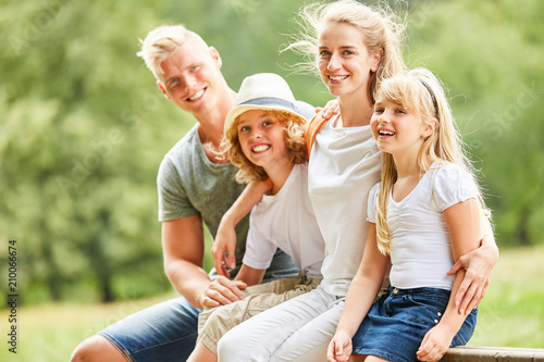 Familie zeigt bunte Zeichnung mit Eigenheim