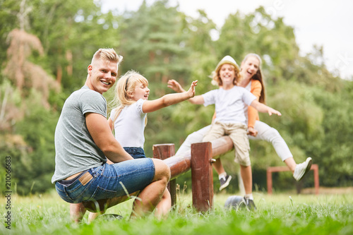 Familie zeigt bunte Zeichnung mit Eigenheim