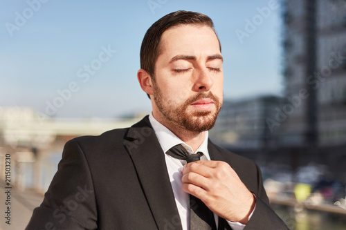 Nachdenklicher ernster Geschäftsmann in der Stadt
