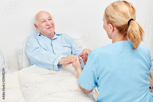 Fürsorgliche Pflegekraft hält die Hände eines kranken Senioren als Sterbebegleitung