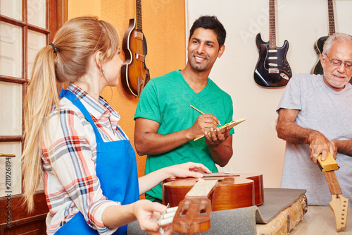 Gitarrenbauer und Lehrlinge in der Werkstatt