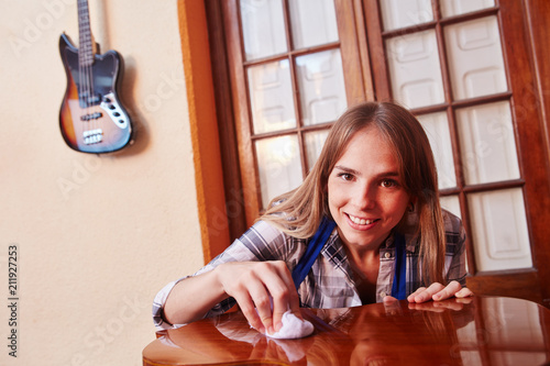 Gitarrenbauer Lehrling bei Pflege einer Gitarre