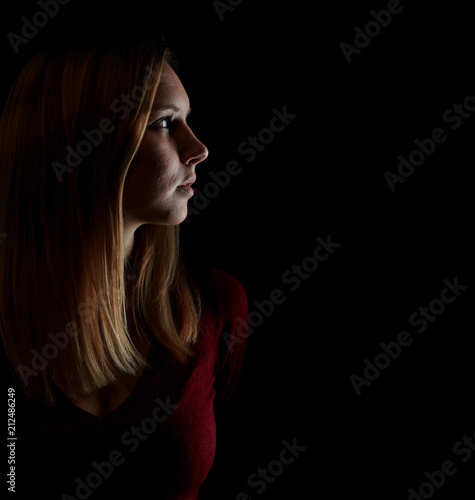 Nachdenkliche junge blonde Frau schaut zur Seite