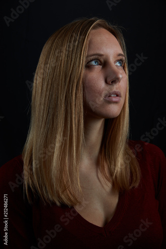 Junge blonde Frau schaut hoffnungsvoll nach oben